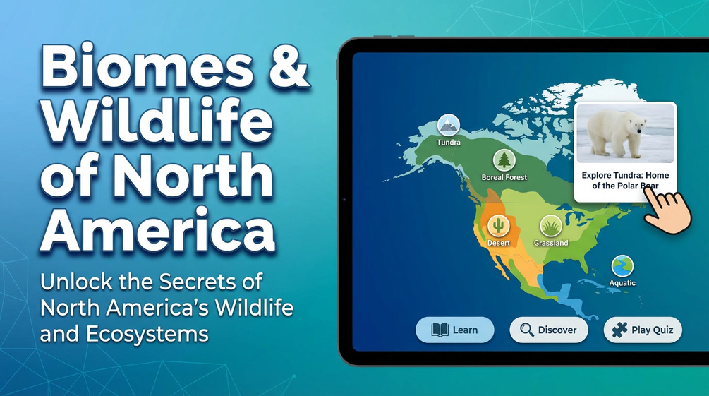 • Interactive map explorer with 6 North American biomes (Tundra, Taiga, Deciduous Forest, Grassland, Desert, Tropical Rainforest)