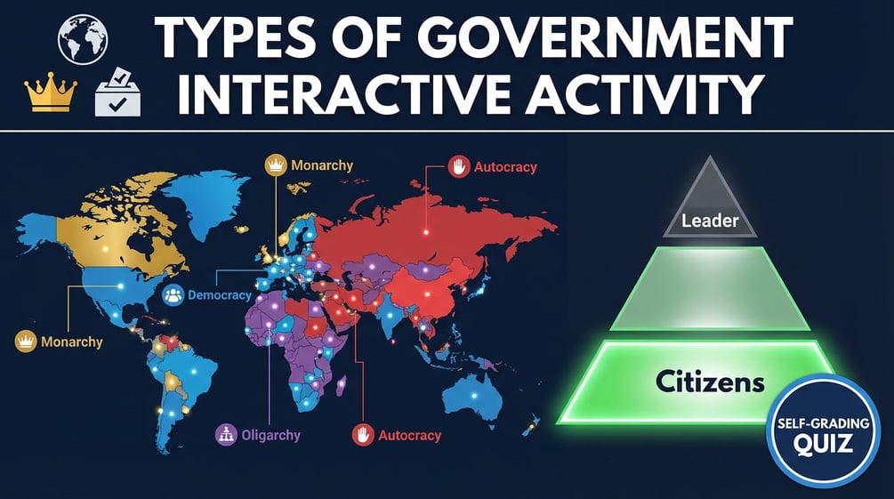 Types of Government Interactive Activity | Self-Grading Quiz | World Map Explorer